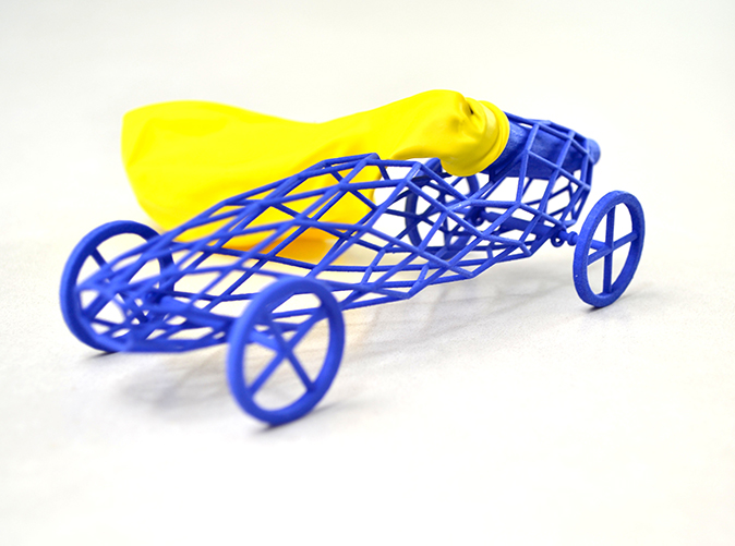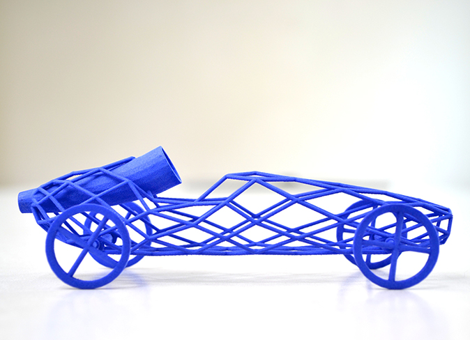 inflate a standard size balloon, wrap it over the nozzle of the car and vroom.. off to the races. Using 3D print technology though made me investigate on how to reduce material usage in order to lower the price. Converting the body to a wireframe mesh was the first step to achieve this whereas the application of the diagrid tessellation fit the body really well and provided a sufficient structural integrity.