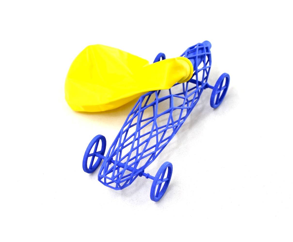 inflate a standard size balloon, wrap it over the nozzle of the car and vroom.. off to the races. Using 3D print technology though made me investigate on how to reduce material usage in order to lower the price. Converting the body to a wireframe mesh was the first step to achieve this whereas the application of the diagrid tessellation fit the body really well and provided a sufficient structural integrity.